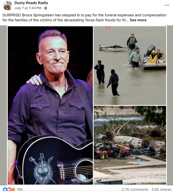 For example, on July 7, the Facebook page Dusty Roads Radio posted (archived) about Springsteen’s alleged generous donation, receiving over 19,000 reactions and nearly 3,000 comments. The post also included a photo of Springsteen on stage among a collage of images from the disaster.