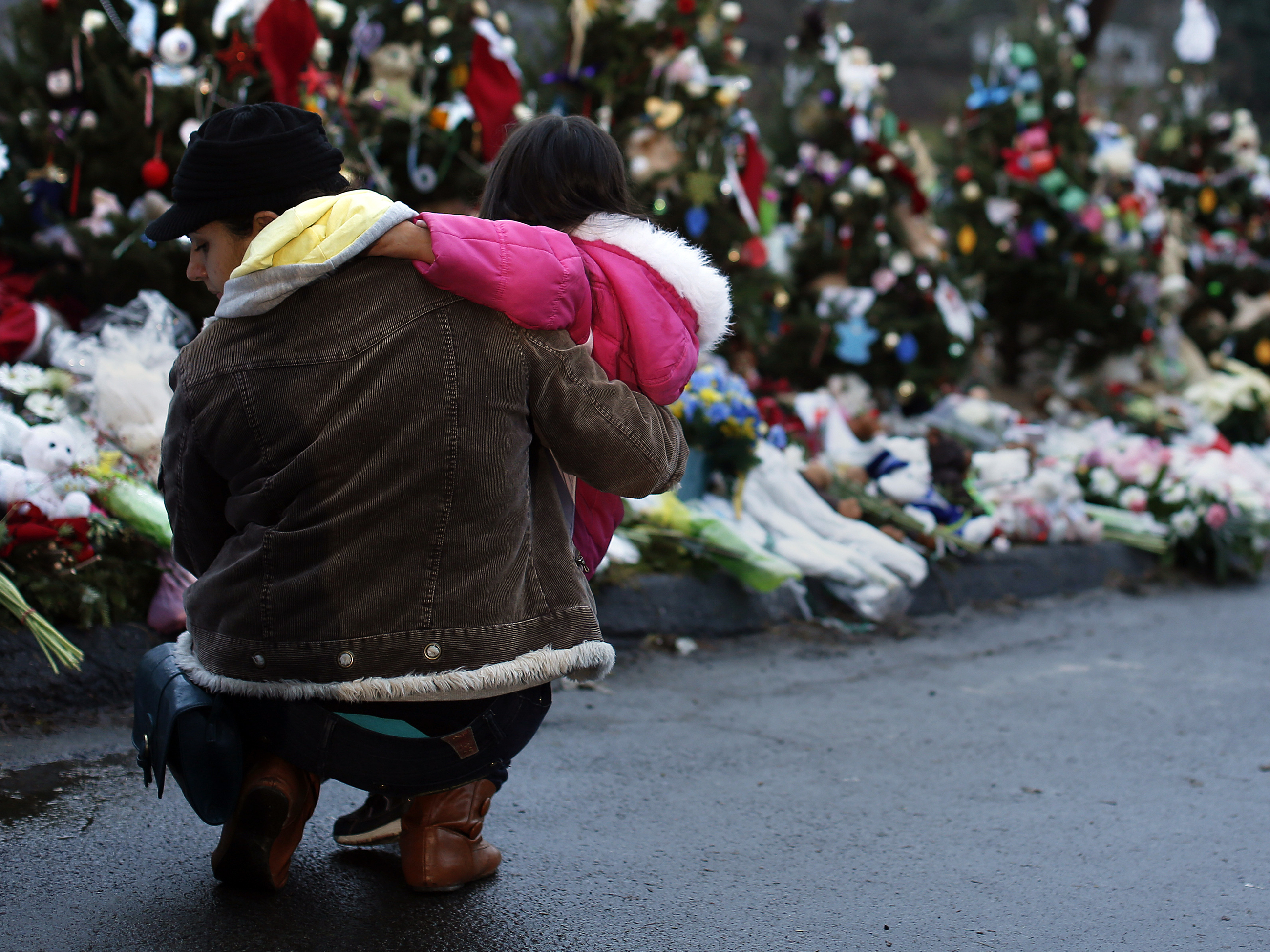 A woman and child earlier this week at a makeshift memorial in Newtown, Conn.