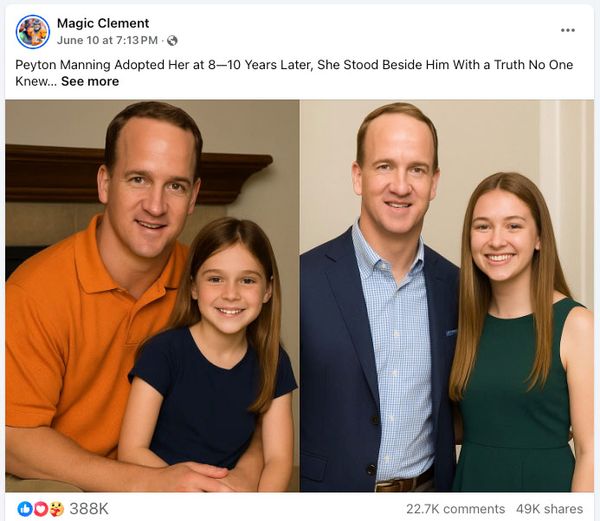 For example, on June 10, the Magic Clement Facebook page posted (archived) the story. The post, which received more than 396,000 reactions and 50,000 shares by the time of this writing, allegedly showed before-and-after pictures of Manning, who retired from the NFL in 2016, posing with the child at 8 and 18 years old. The story’s headline read, “Peyton Manning Adopted Her at 8—10 Years Later, She Stood Beside Him With a Truth No One Knew.”