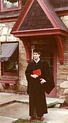 Peter Strupp, seen on graduation day in front of the Christian fellowship house that took him in at the University of Wisconsin.
